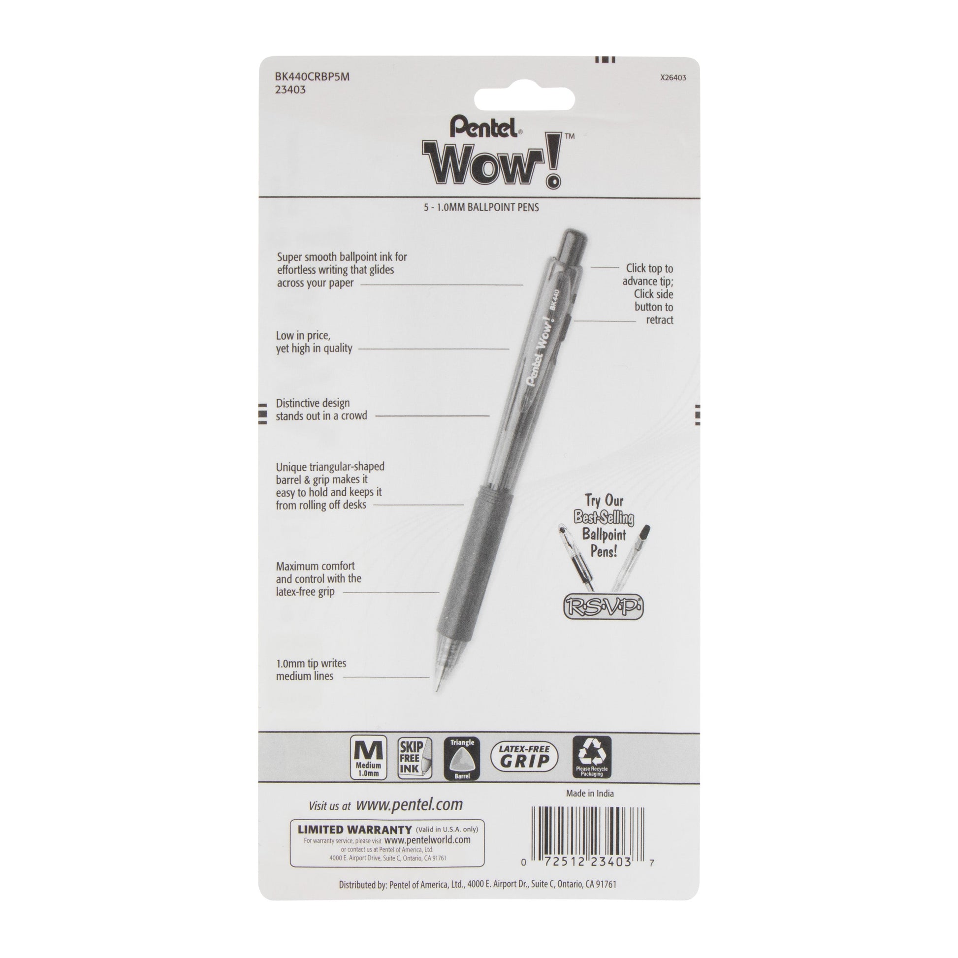 Wow! Retractable Ballpoint Pen, (1.0m) Medium Line, NEW Ink, Assorted Ink (D/F/P/S/V) 5-Pk (BK440CRBP5M)