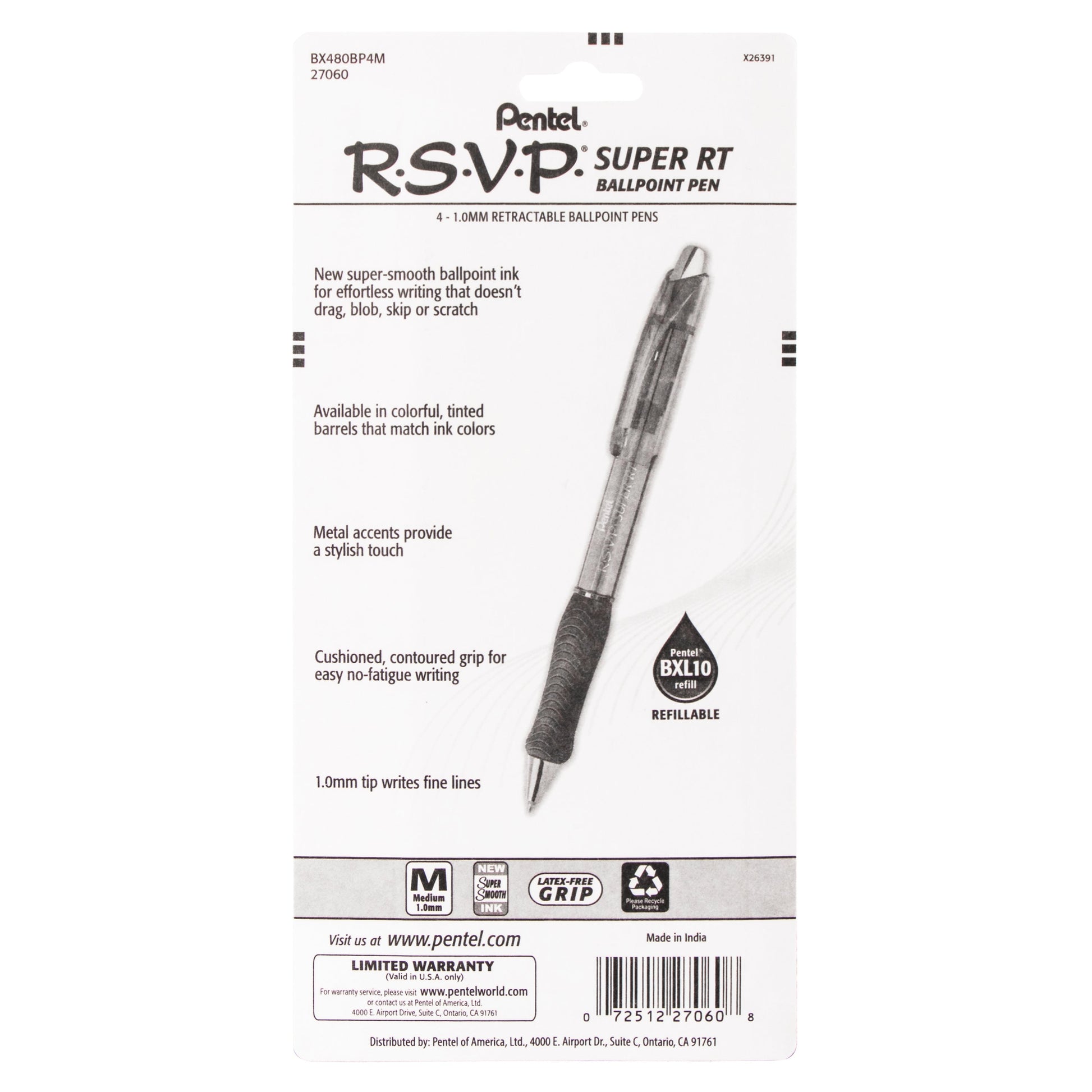 RSVP Super RT Ballpoint Pen, (1.0mm) Medium Line, Assorted Ink (ABCD), 4-Pk (BX480BP4M)