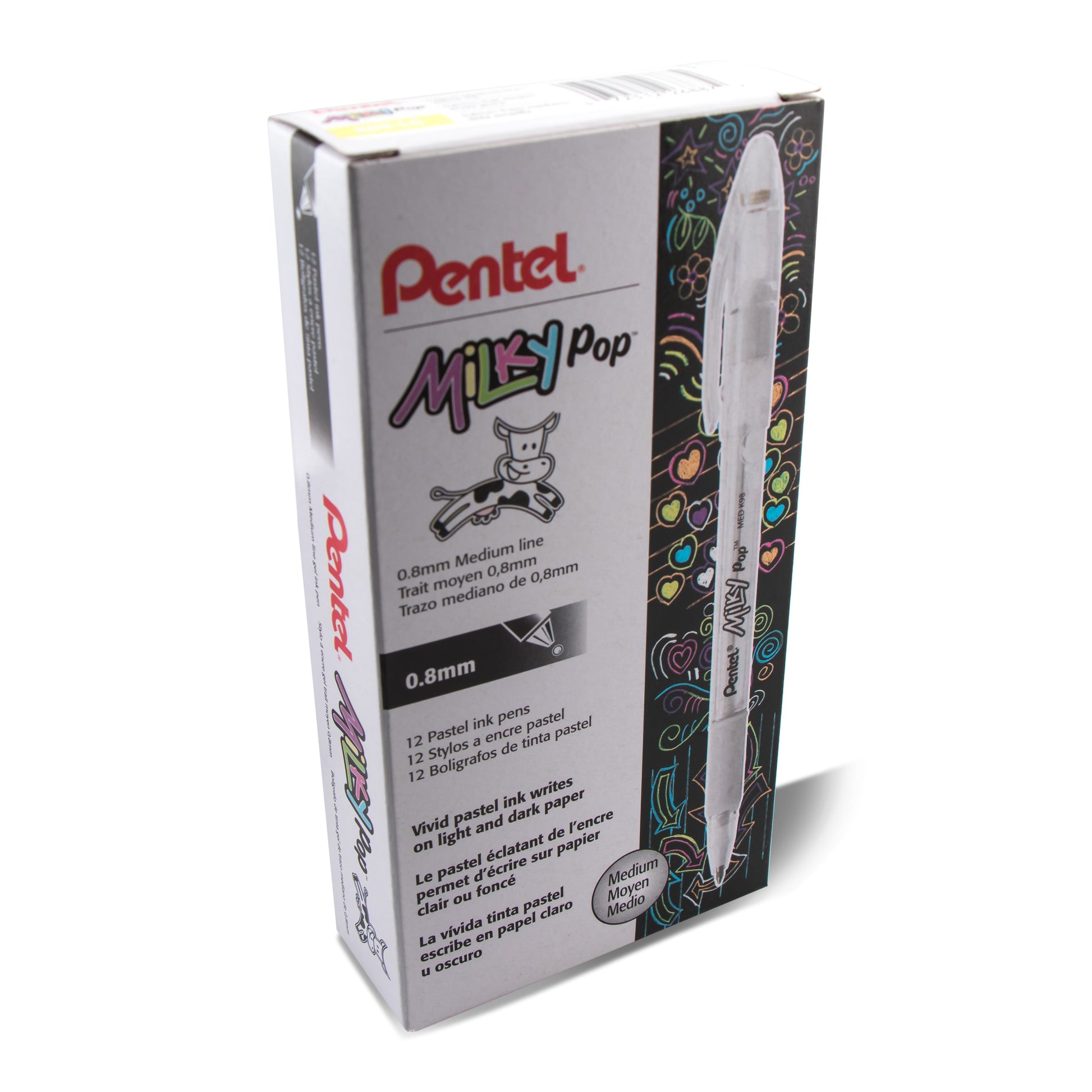 The Pentel® Milky Pop™ gel pens add a “Pop†of color to any page. Milky pastel colors work on light or dark colored paper to make your writing and artwork stand out. Smooth gel ink and extra-long balanced barrel for effortless writing and control. Latex-free grip for comfortable writing and drawing. .8mm metal tip writes medium lines. AP Certified. Backed by a Limited Lifetime Warranty