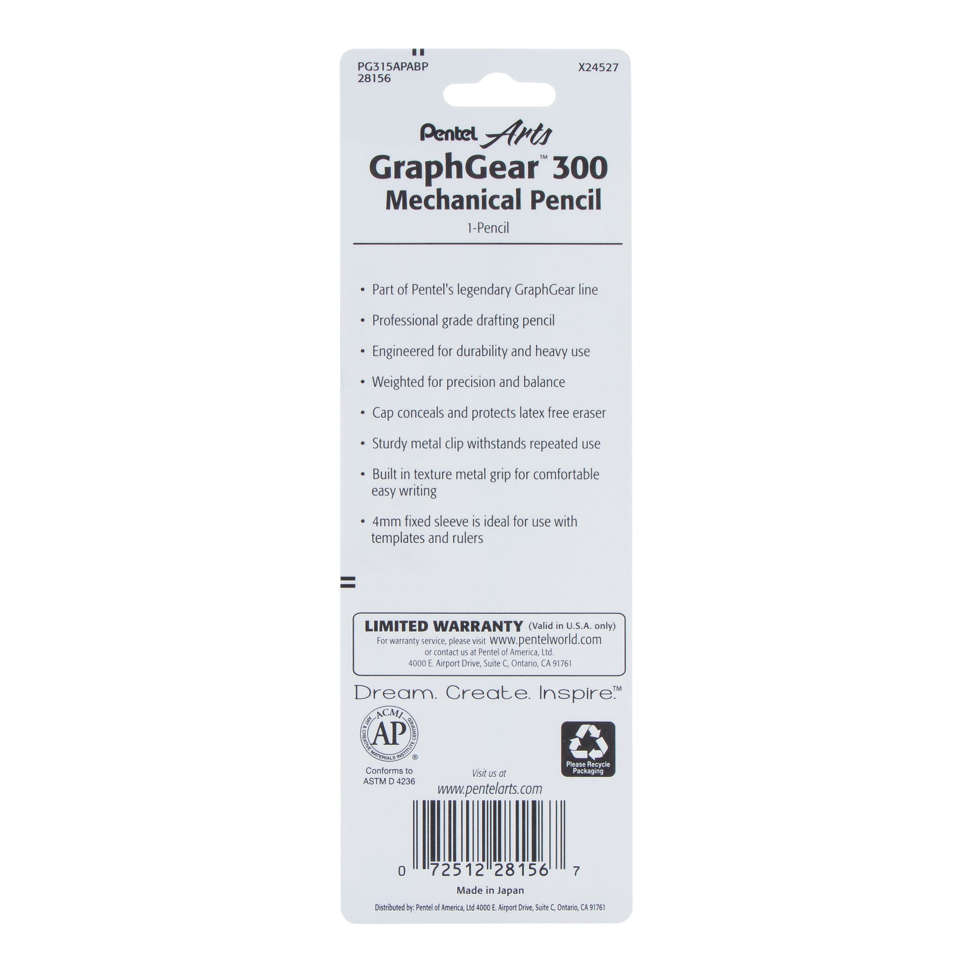 Pentel Arts GraphGear 300 Mechanical Pencil, (0.5mm) Fine line, 1-Pack, Black Barrel (PG315APABP)
